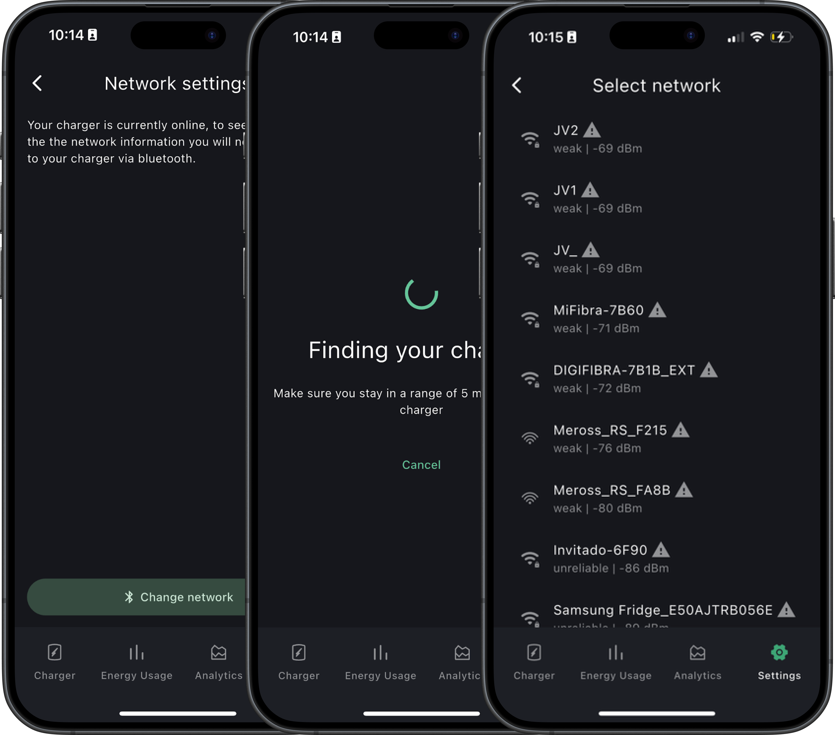 If stuck in the 'Finding your charger' loading screen, the Hypervolt may have automatically disabled the BLE signal. Try rebooting the charger one more time.