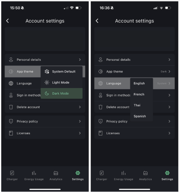 - App Theme: Choose from three visual themes for the Hypervolt App, including Light and Dark modes.