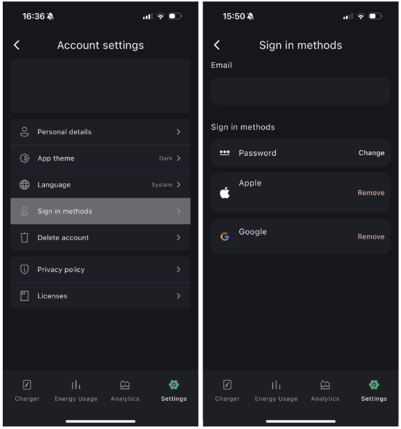 - Charger settings: Access the current configuration, including access to settings like schedule, brightness, max charge rate and more.