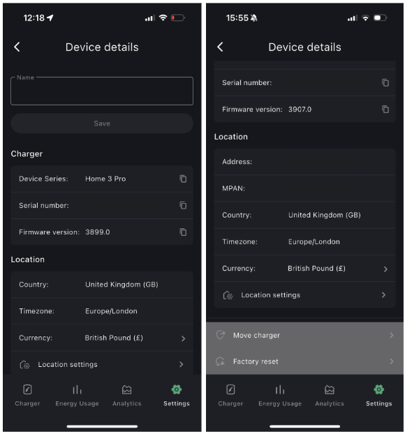 From this page you will also be able to Move Charger or perform a Factory Reset.